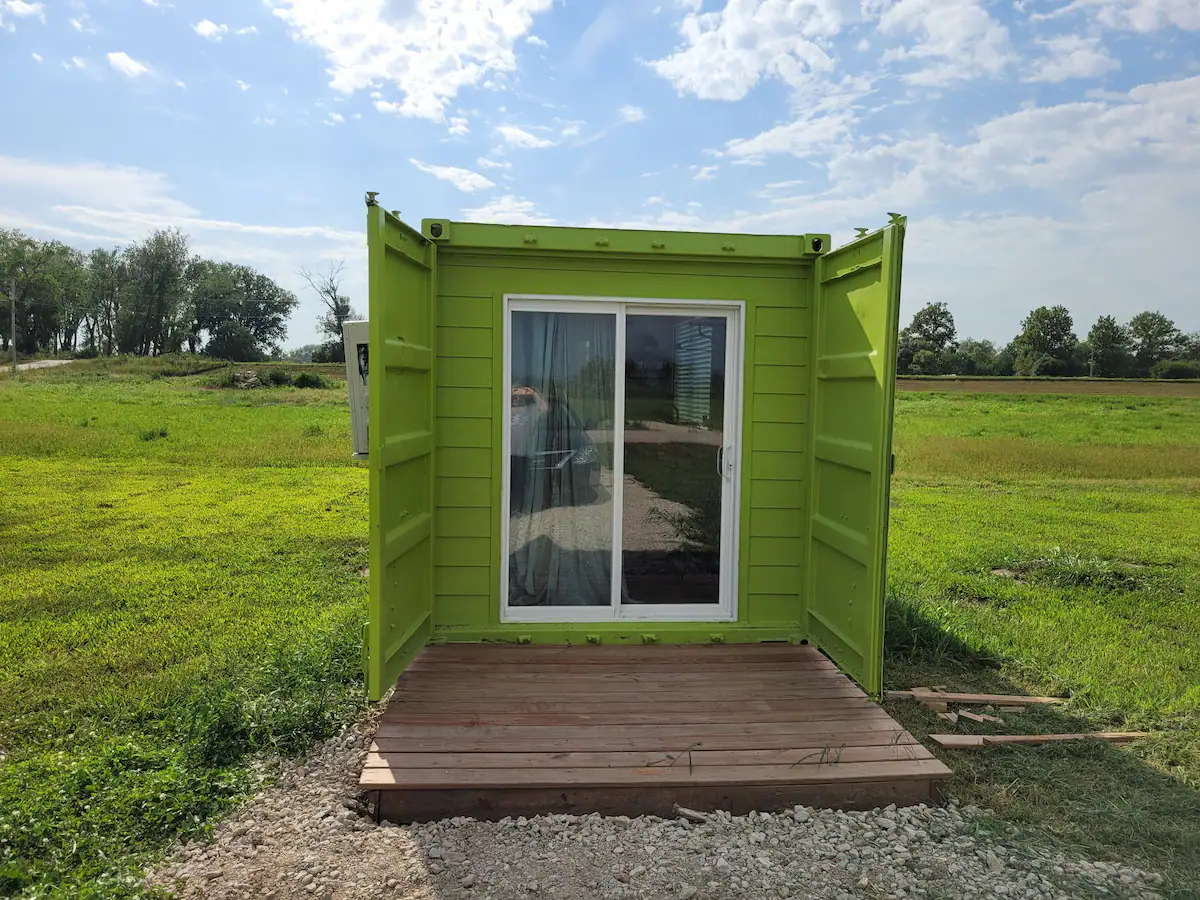 Get your Glamp on in the Lady Bug Tiny Home at Bartlett Shores! Experience tiny home living in this unique shipping container home.