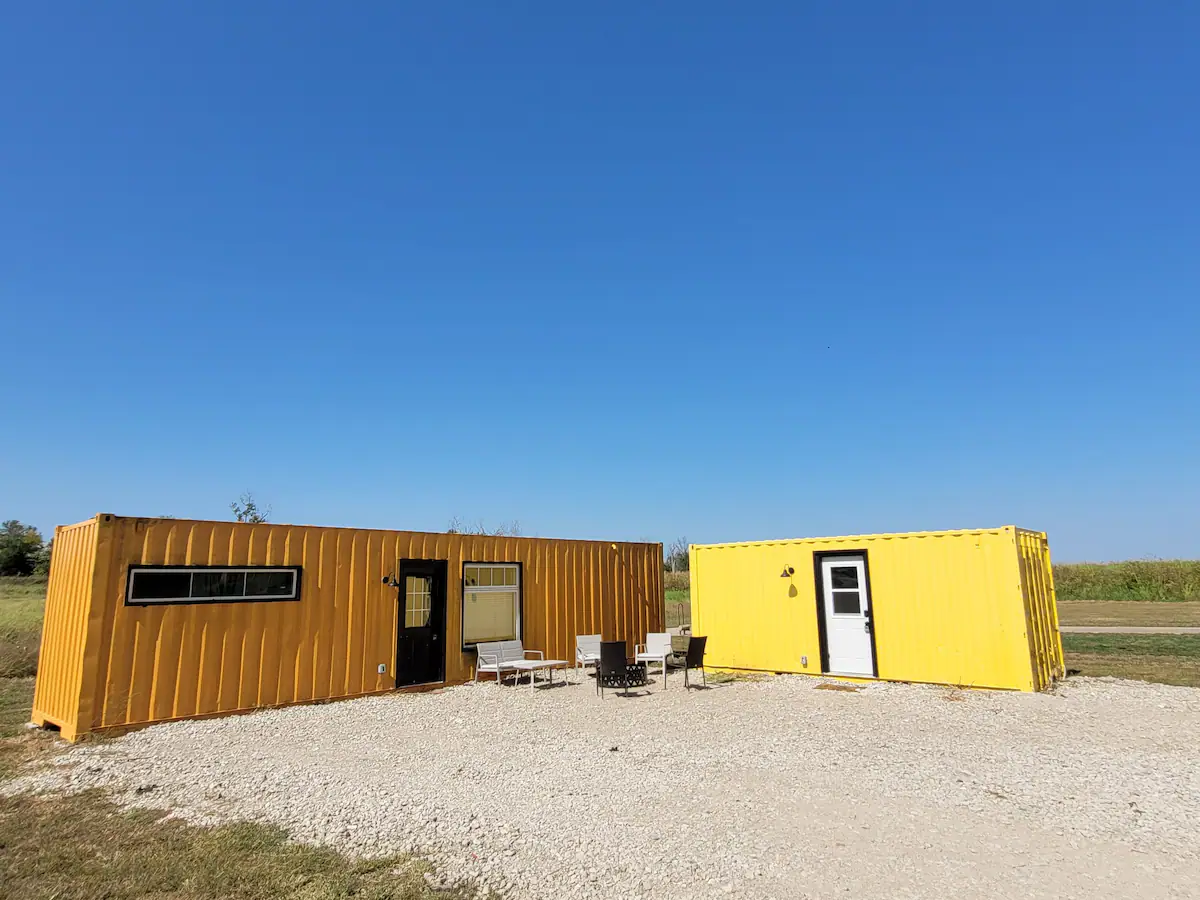 Visit the Monarch Tiny Home & Bumblebee Bunk House today for a unique glamping getaway in Bartlett, IA. These shipping container tiny homes offer a cozy and cool spot for the whole family or friend group! The Monarch boasts a full bath, queen bedroom, dining area and kitchenette. The Bumblebee Bunk House adds another queen bed and twin bunks to host your whole group!